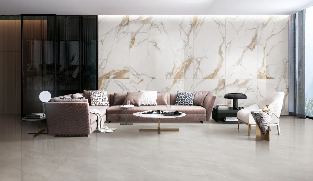 羅曼締克瓷磚【魚肚金】規格為600x1200mm/900x1800mm,家裝可用在客廳、餐廳、浴室等區域,亦可應用在酒店大堂、高檔會所等商業空間中。