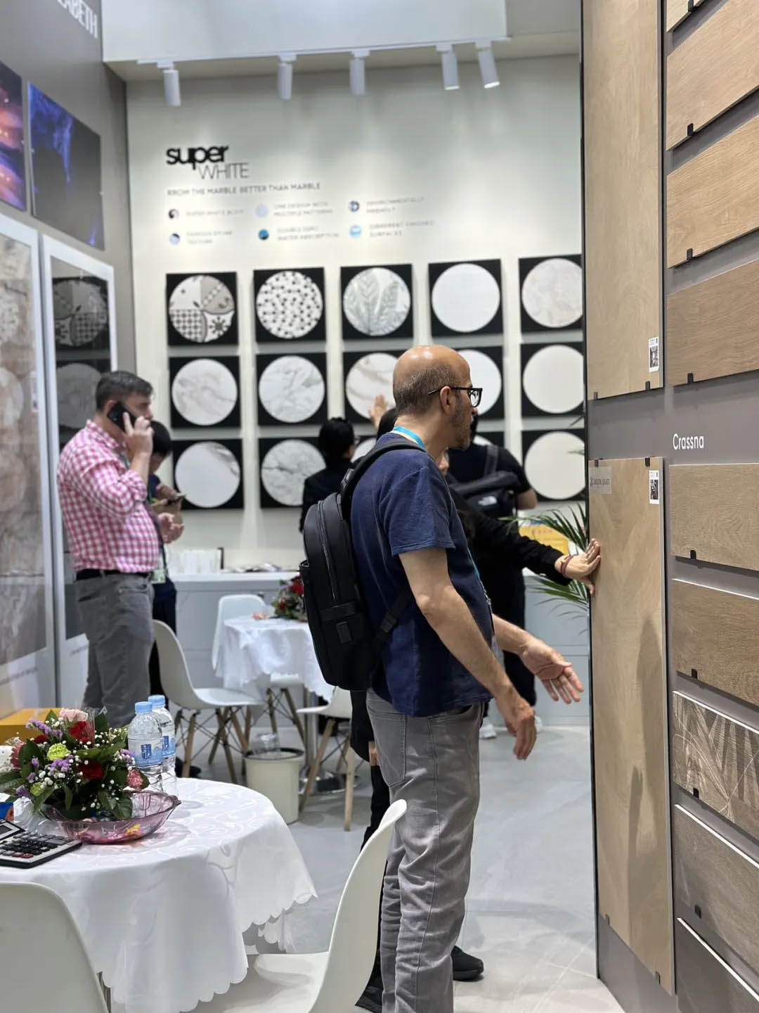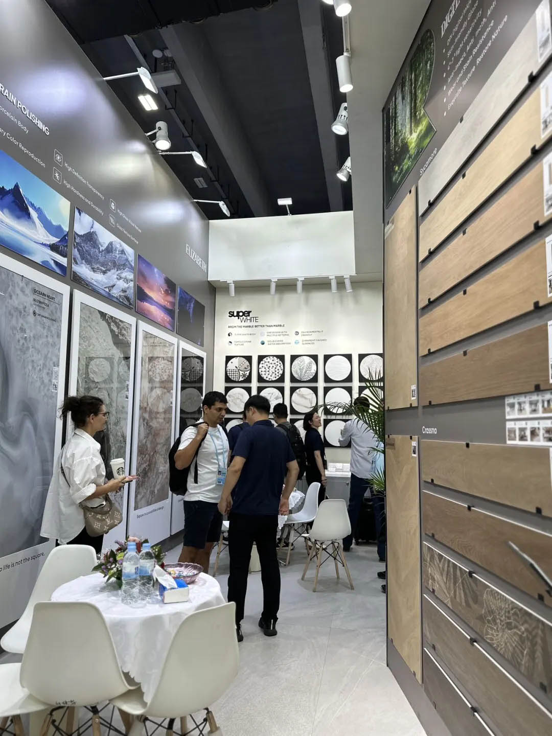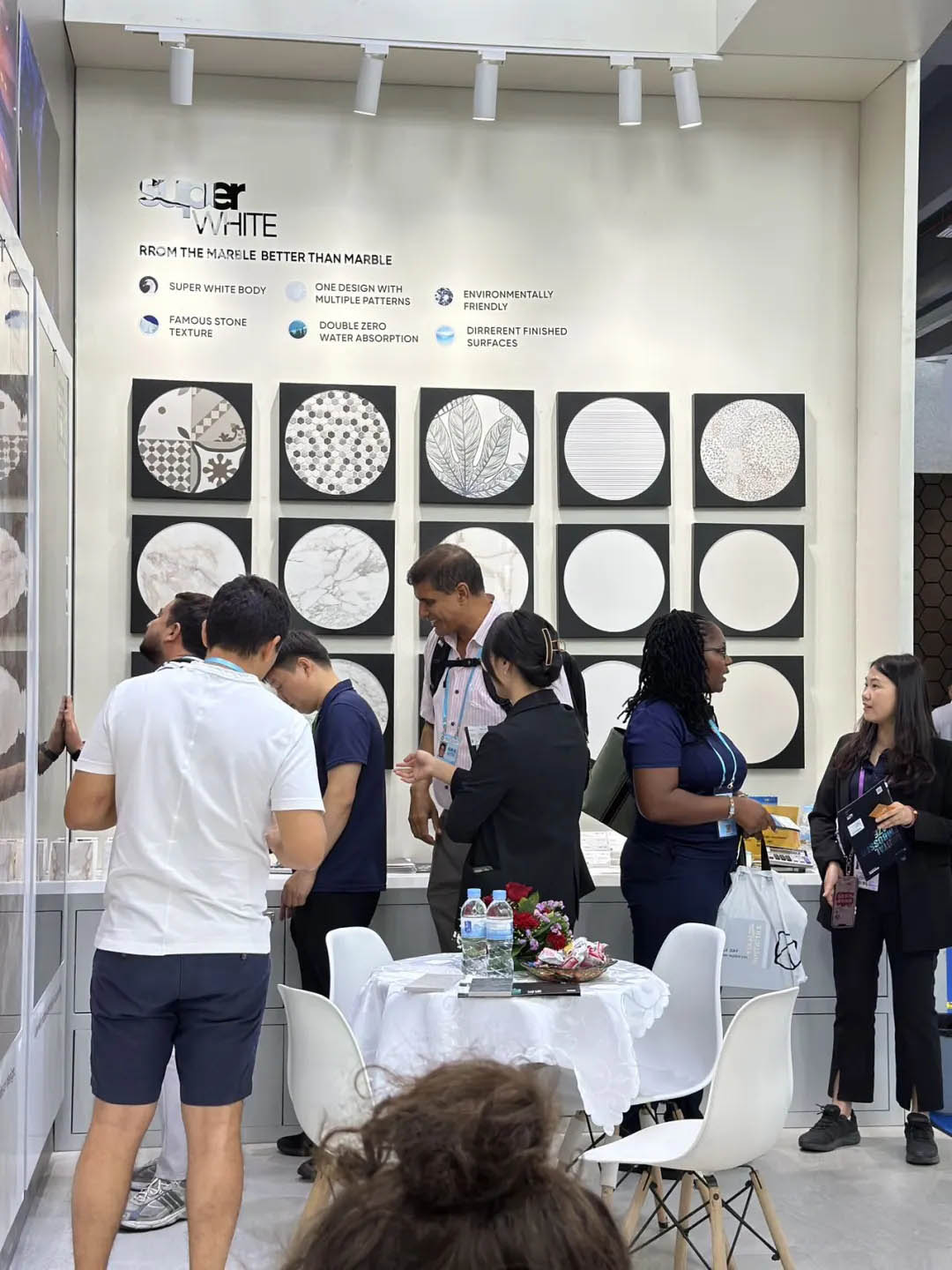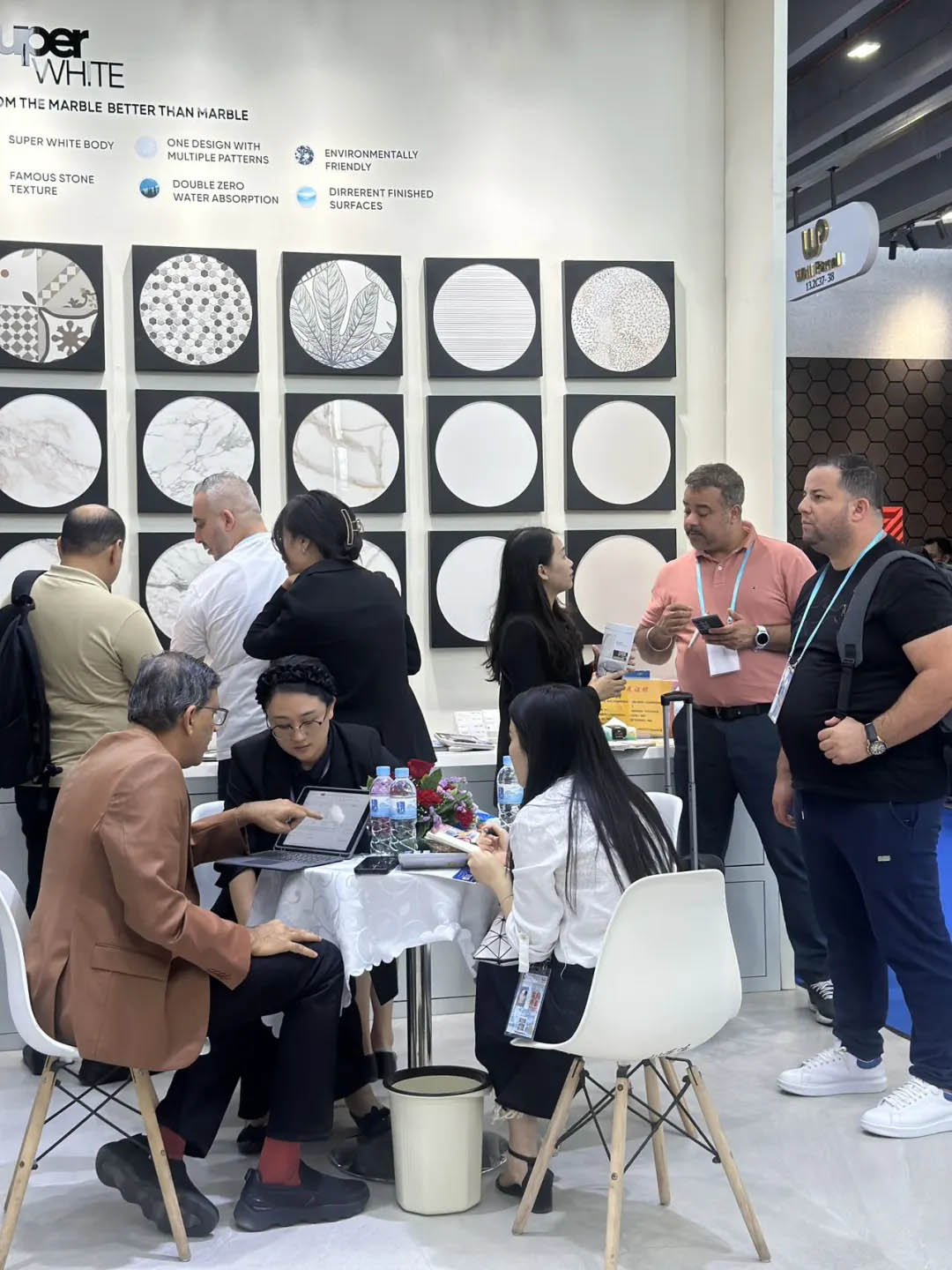 開展首日,羅曼締克瓷磚展位內可謂是人潮涌動,以“全球同步 品質同行”的品牌定位、獨具特色的趨勢產品,吸引全球各地的參展商駐足觀看、洽談,在廣交會上更是攢足眼球。