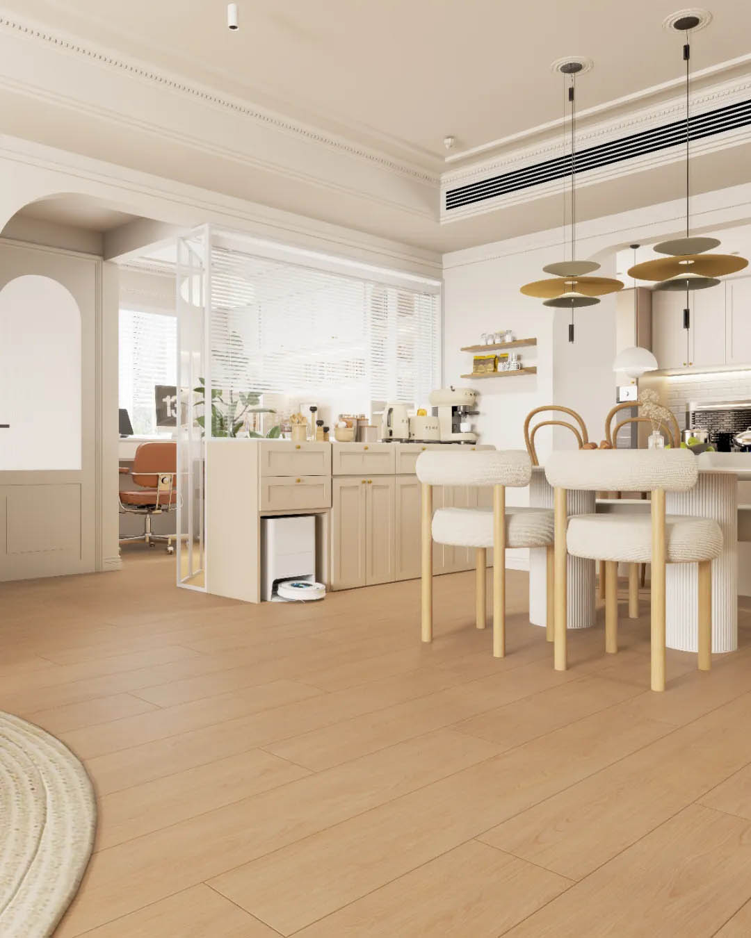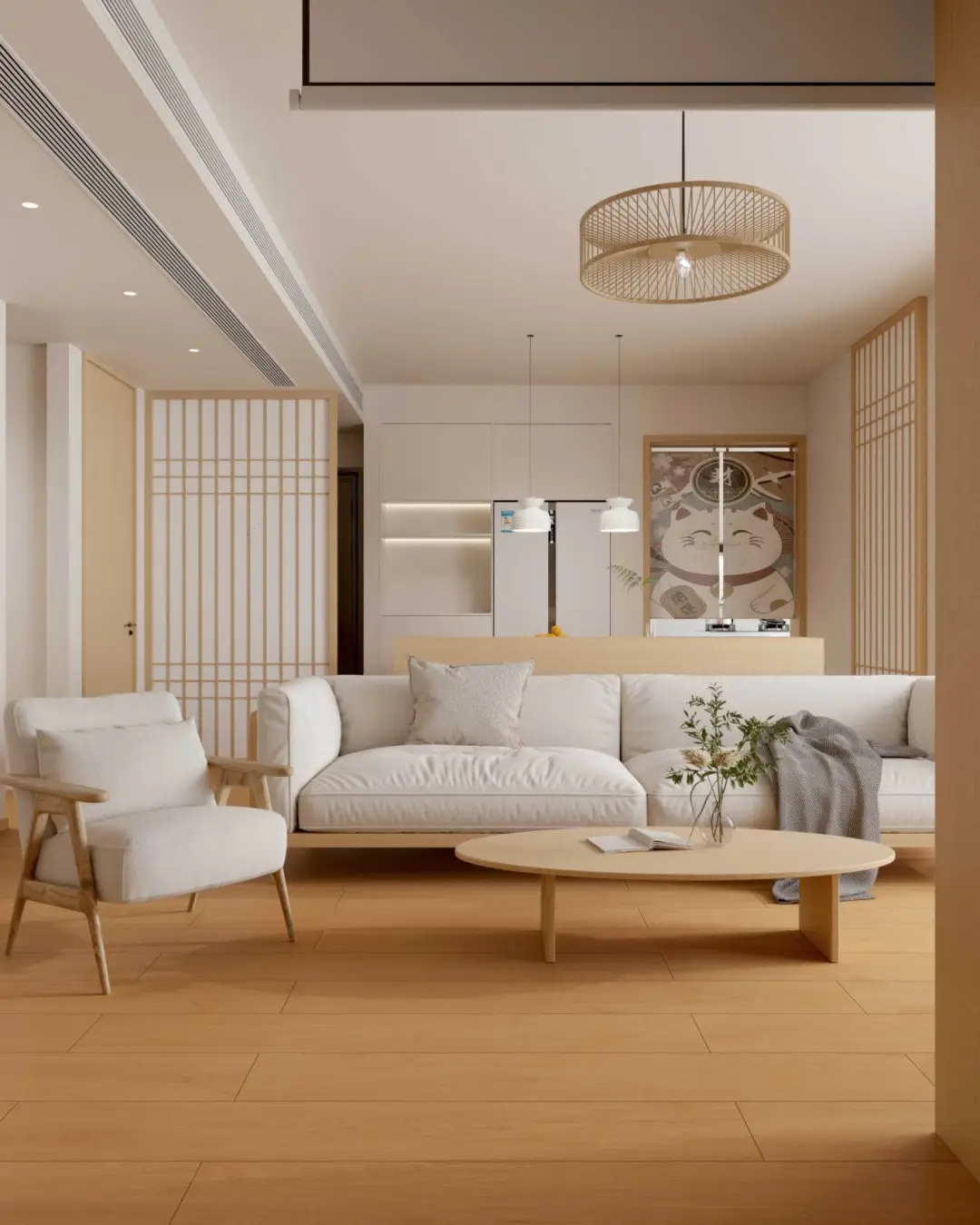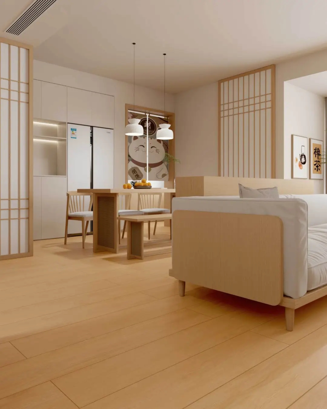 整體空間以原木為筆觸,梧桐黃調木紋磚沉穩(wěn)肌理,結合三七錯縫鋪法,在日式原木家具的溫潤觸感下,織就一幅克制而豐盈的畫卷。