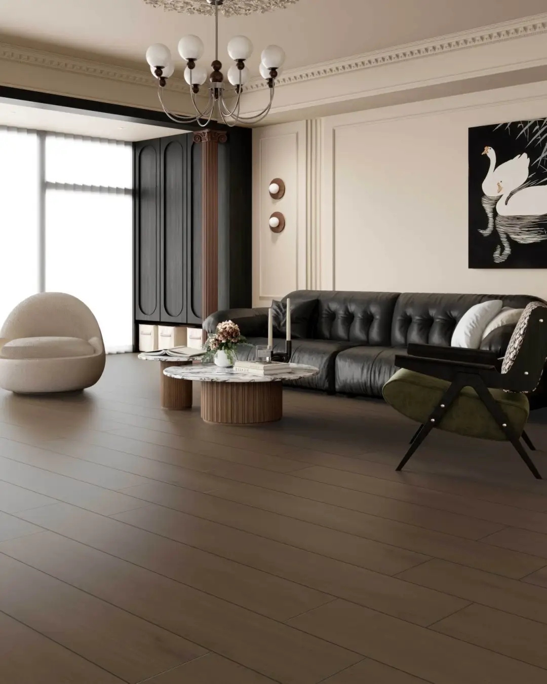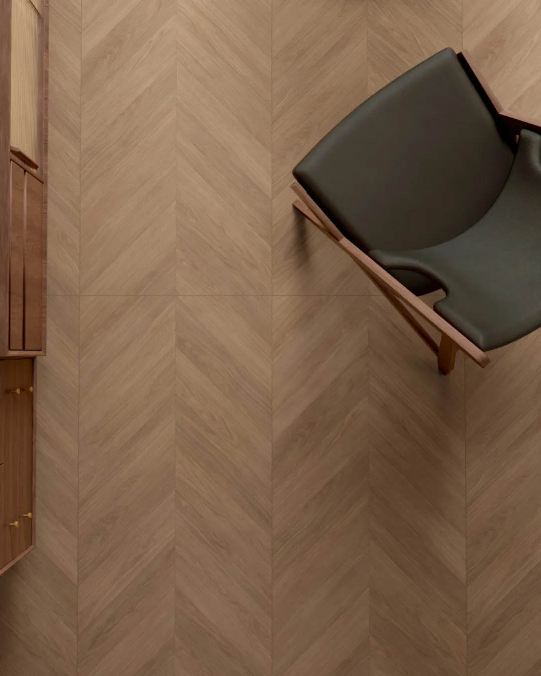 空間的層次在材質中自然遞進,深色木紋磚,是意式的低音符,光線穿透木紋肌理,也塑造了極簡而不失韻律的視覺層次。