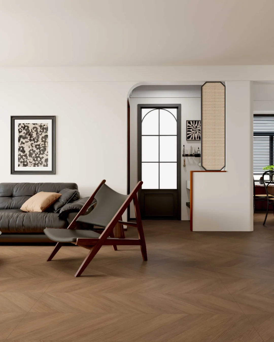 動靜分隔,動線流暢,通過軟裝和胡桃木色的木紋磚增添復古韻味,魚骨紋鋪法,沉穩(wěn)內斂,讓空間如一部1960年代黑膠唱片機,在婆娑中低吟復古爵士旋律。