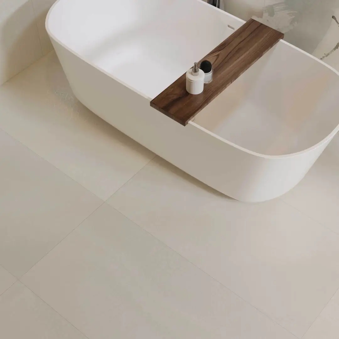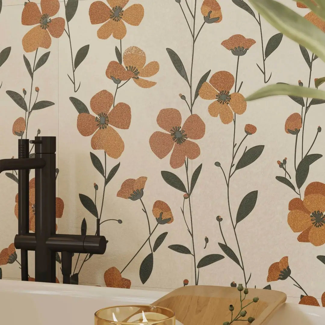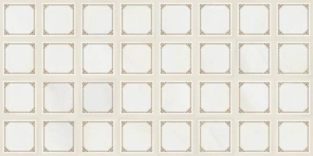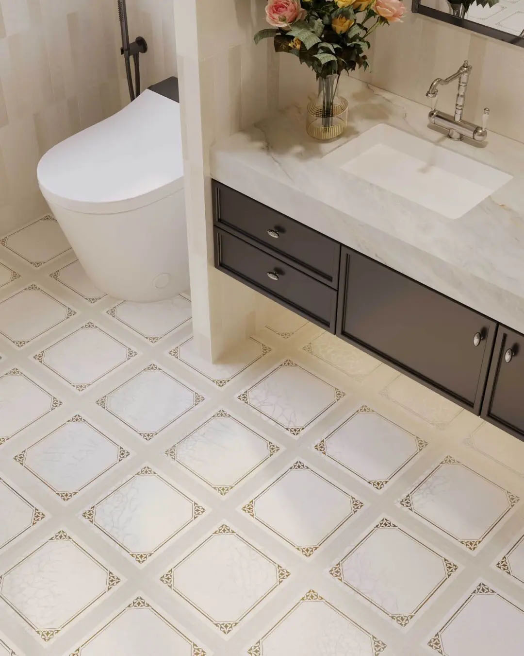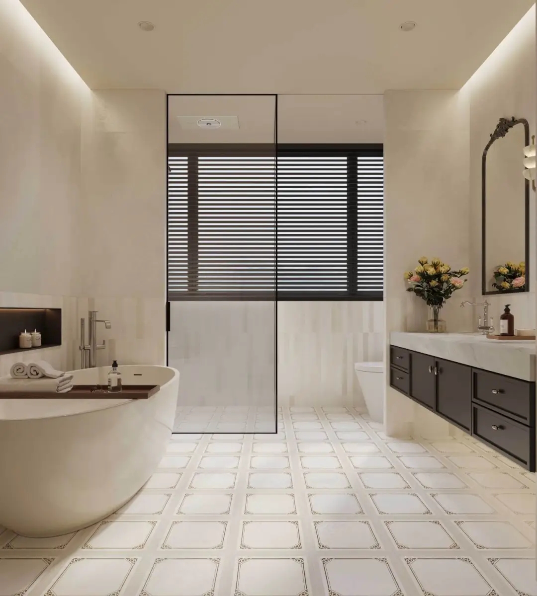 米白色肌底上,菱格紋以嚴謹的秩序感重構了冰裂紋的隨機美學,四周環繞的精美花紋邊框,恰似古典畫框的現代演繹。應用于衛浴間地面之上,菱格的理性秩序與邊框的細膩雕琢,在碰撞中重構東方意境,賦予傳統以摩登張力。