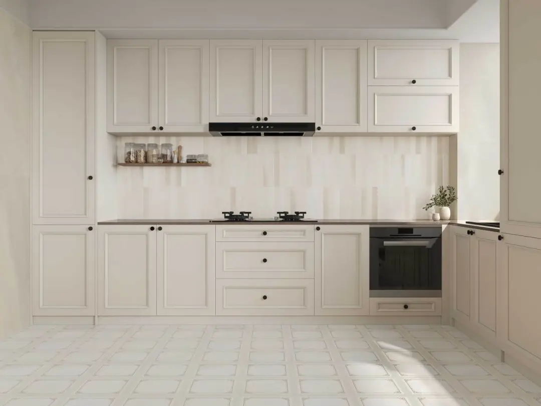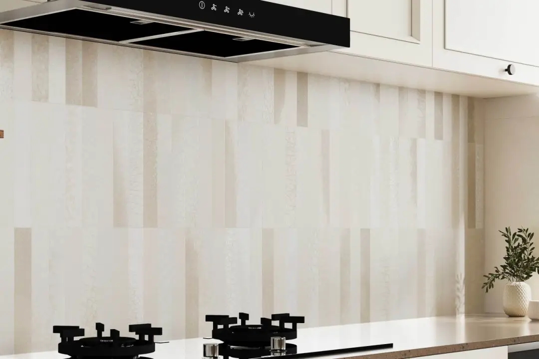 米白淺調為底,利落的豎條紋將裂紋解構為現代幾何語言。鋪陳于廚房墻面,豎紋延展了視覺縱深,簡潔的肌理在光影中形成微妙層次。空間仿佛被施以留白的魔法,浮躁悄然沉淀,只余下空靈悠遠的靜謐與優雅。