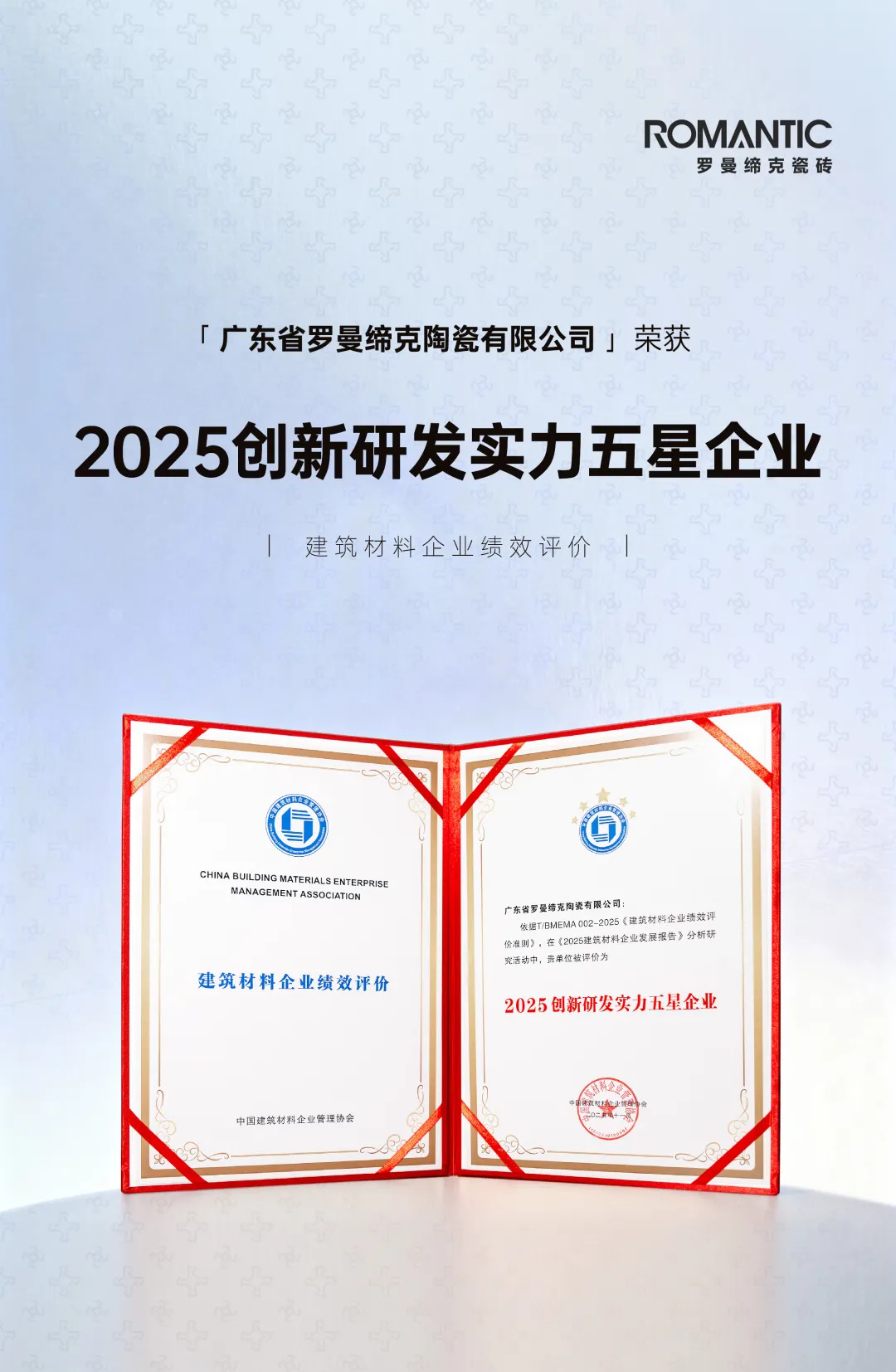 T/BMEMA002-2025《建筑材料企業績效評價準則》是中國建筑材料企業管理協會發布的重要團體標準,旨在建立科學、規范的企業績效評價體系,引導建筑材料企業高質量發展。獲得“五星”最高評級,不僅是一份榮譽,更是一份具備標準依據的硬核實力的證明,它客觀地反映出羅曼締克瓷磚在創新機制、技術儲備與成果產出方面的綜合優勢,為企業品牌形象提供了強有力的權威背書。